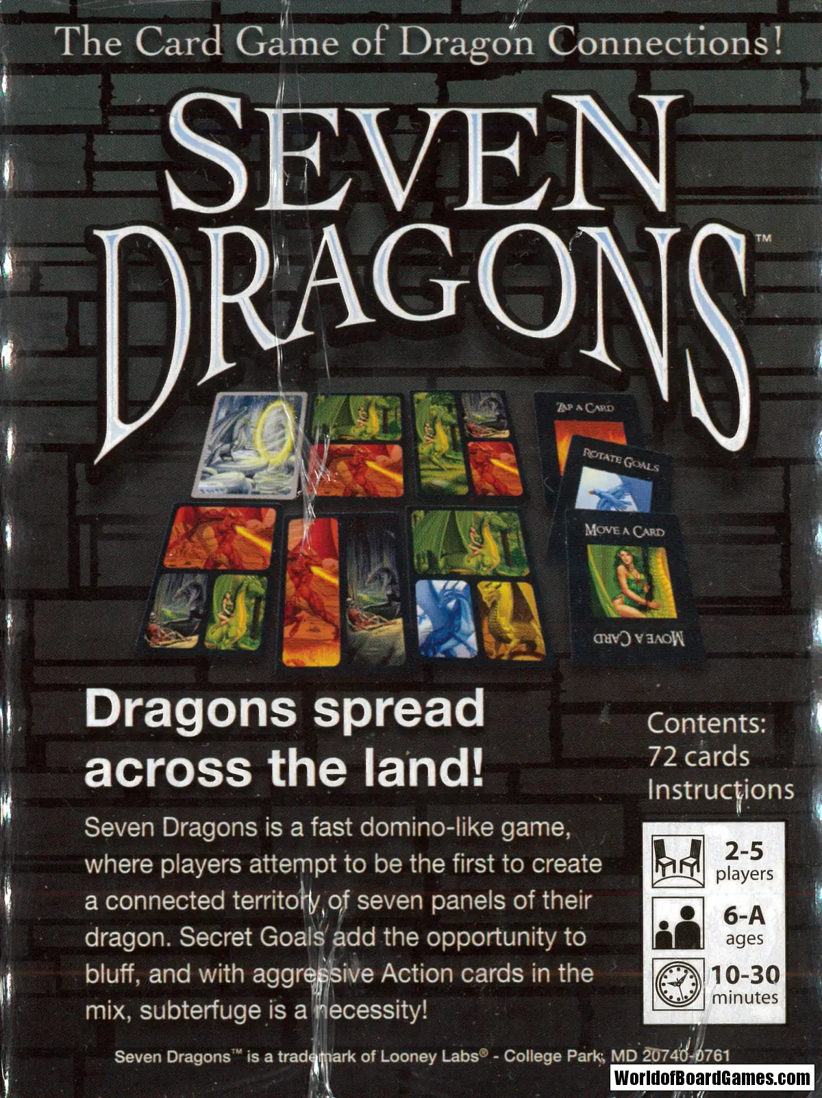 Seven Dragons is a fast domino-like game, where players attempt to be the first to create a connected territory of seven panels of their dragon. Secret Goals add the opportunity to bluff, and with aggressive Action cards in the mix, subterfuge is a necessity! Seven Dragons features original paintings by Larry Elmore, the greatest dragon artist in the fantasy industry today!