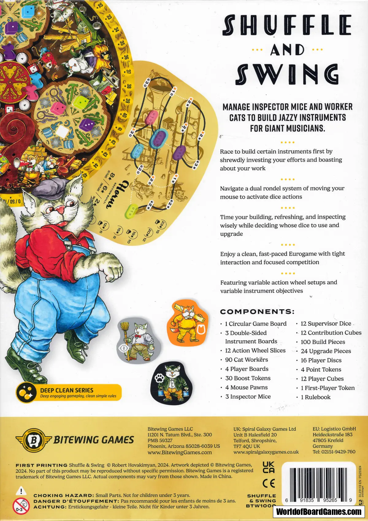 Shuffle and Swing invites players into a vibrant jazz-themed factory, where strategic management and clever interactions determine who rises to the top. Using dual-layered rondels, players recruit feline workers, utilize shared supervisor dice, and carefully plan their moves to construct impressive jazz instruments. Collaboration and competition blend seamlessly as players race to build efficiently while ensuring their efforts are recognized by management. Rich with tactical choices, charming characters, and lively interactions, Shuffle and Swing delivers deep strategic satisfaction with every play.