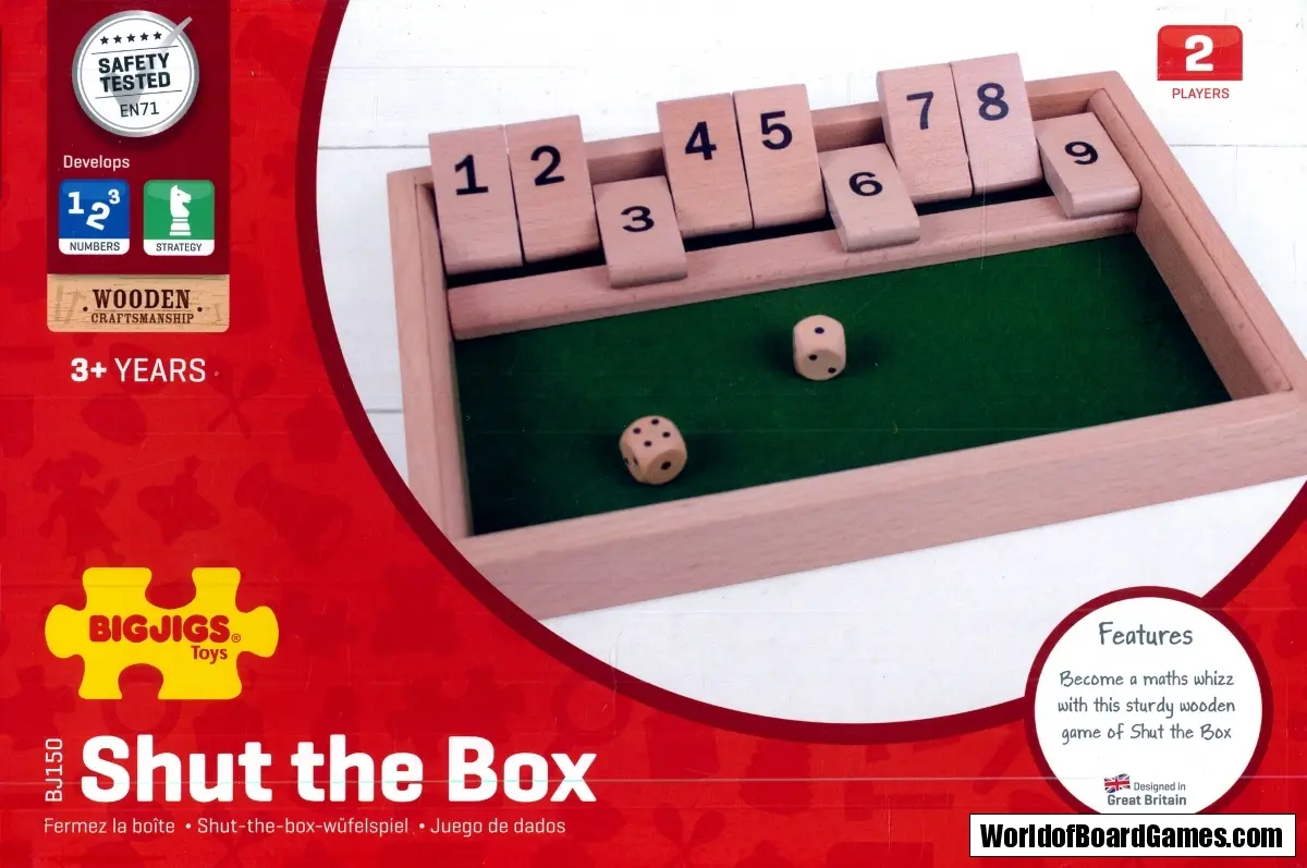 Shut The Box is a fun game that will help youngsters to improve their numeracy skills. Roll the pair of dice and 'shut' tiles which equal the total of the dice roll. Continue play to 'Shut The Box' and win, or until no more tiles can be shut. Educational and fun, it can be played by one or more players. This wooden version of Shut The Box is played within a traditionally crafted wooden frame featuring a felt playing board.