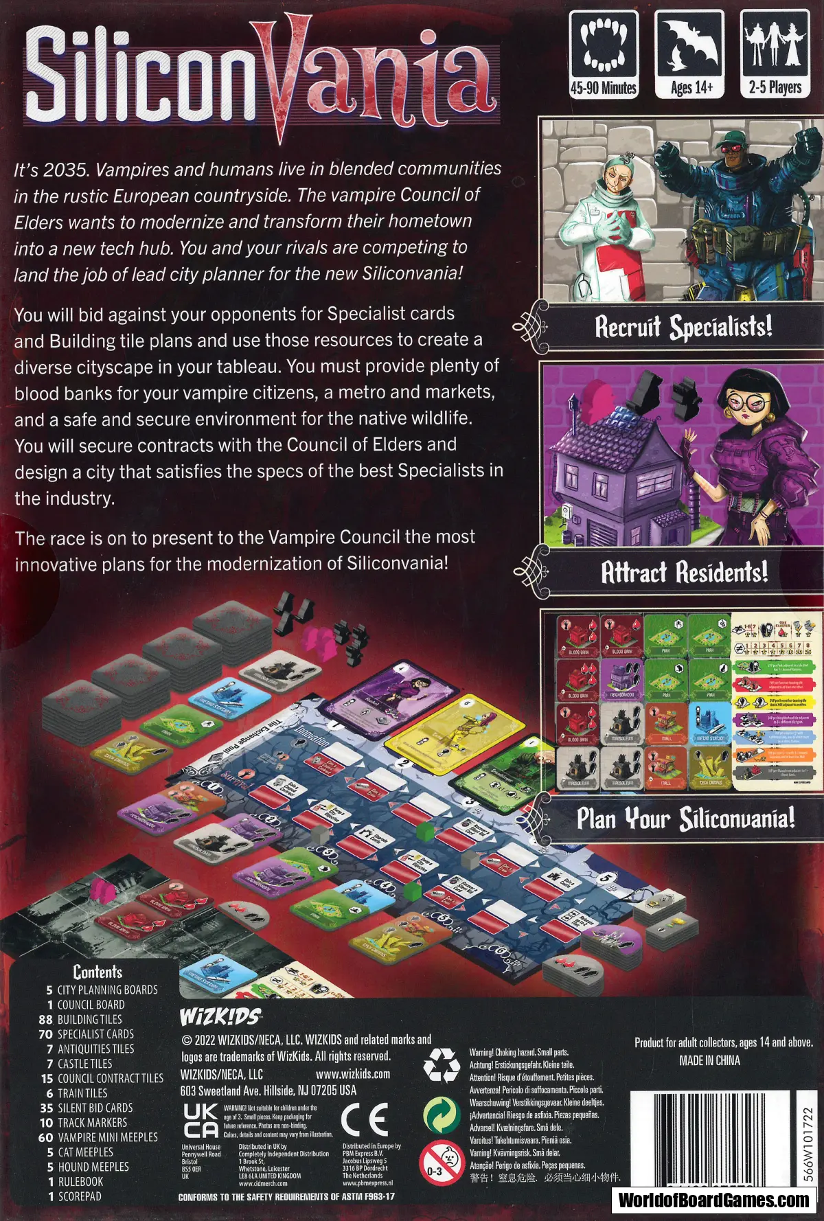 In SiliconVania, players bid on building tiles and multi-use specialists that provide either one-time bonuses, or end-of-game scoring. Players take the building tiles they win, and place them in their 4x4 city grids, juggling different scoring opportunities, and collecting vampire and pet meeples that are looking for places to live!