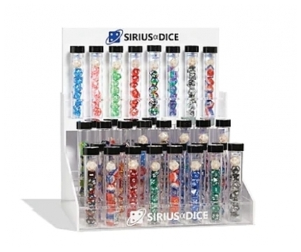 Tärningarna ligger i en genomskinlig stabil plasttub med svart lock och platt botten. Tuben kan stå både på lock och botten. Lätt att ta med och bra som förvaring.