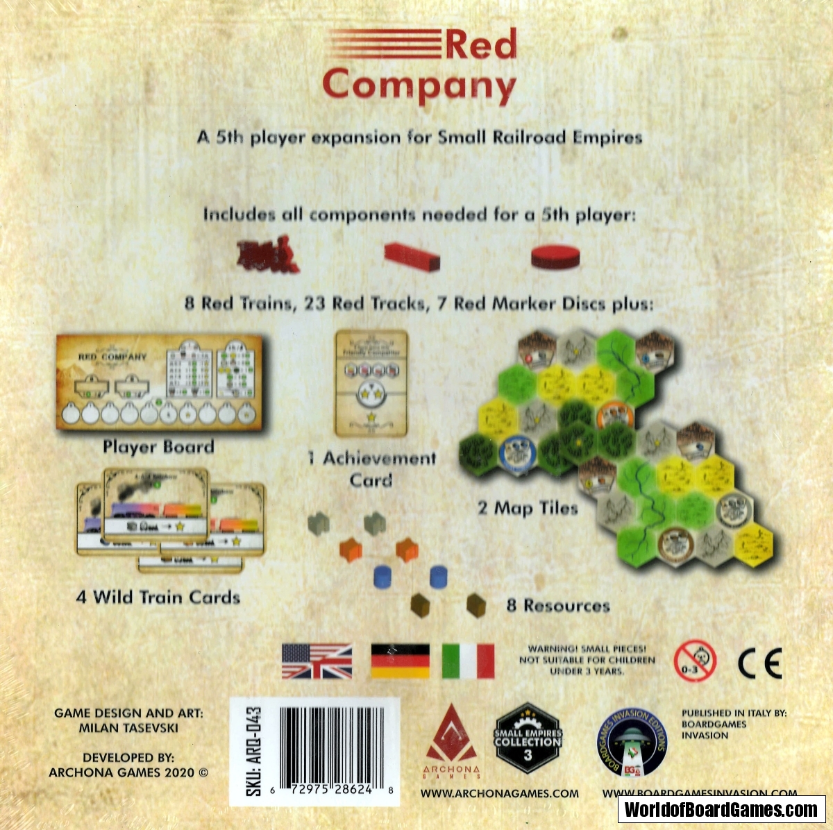 Expansion for Small Railroad Empires featuring 5th player pieces, and extra components such as: new achievement card, and 4x new train (wild) cards.