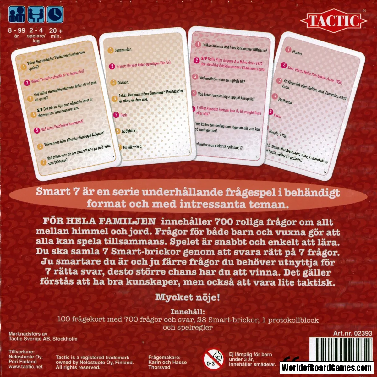 Här gäller det att först nå sju rätta svar, det fi nns säkerhetsnivåer som gör Smartspelen annorlunda jämfört med andra frågespel. För varje rätt svar vinner du en bricka i din färg. Ju färre frågor du behöver utnyttja för sju rätta svar, desto snabbare kan du samla dina sju brickor och vinna omgången/spelet. Varje spel innehåller 700 frågor och svar där inlägget fungerar som korthållare. Dessutom ingår 28 Smart-brickor, ett protokollblock samt spelregler. för sju rätta svar, desto snabbare kan du samla dina sju brickor och vinna omgången/spelet. Varje spel innehåller 700 frågor och svar där inlägget fungerar som korthållare. Dessutom ingår 28 Smart-brickor, ett protokollblock samt spelregler.