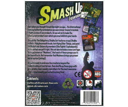 Smash Up: The Obligatory Cthulhu Set features crazy Cthulhu cultists, fishy Innsmouth locals, horrifying Elder Things, and good old Miskatonic University members (the Fightin' Cephalopods). To be certain we got it right, this set also includes a new card type fittingly known as "Madness" that each of these groups can use to various effects. Just remember that Madness brings you power but at a price (joking!).