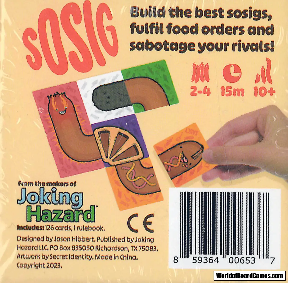 Sosig arrives as a pocket sized family friendly option to the Joking Hazard roster, focusing on competitively creating the ideal Sosig to defeat the other players. Players use a variety of head and body cards to create Sosigs of different shapes and sizes, while using "Mystery Meat" cards to sabotage each other's goals as they attempt to win awards and fulfil different orders, adding a competitive depth to the gameplay.