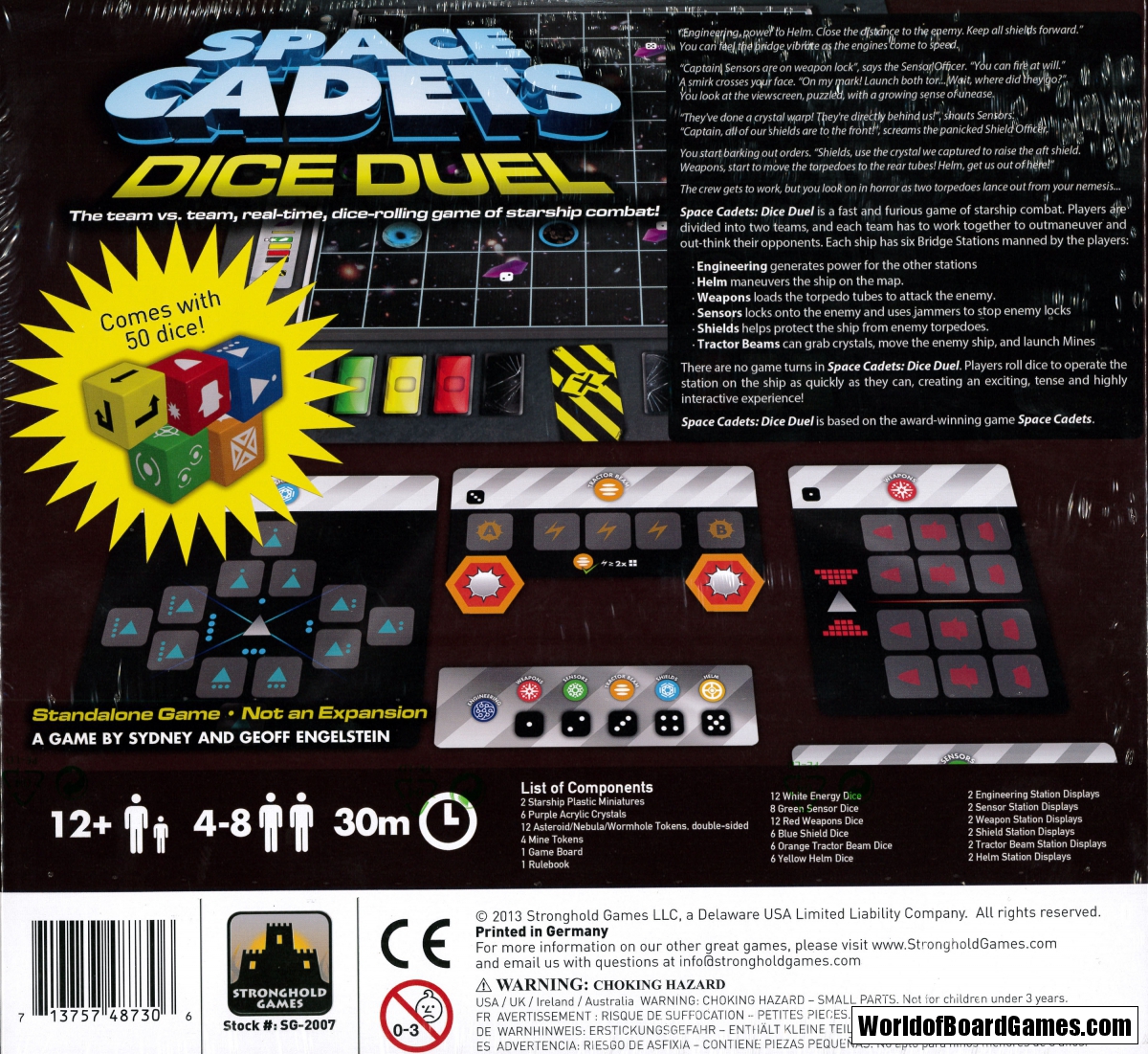 "Space Cadets: Dice Duel" contains many high-quality components, including 50 DICE (mostly custom, engraved dice) and 2 starship miniatures.