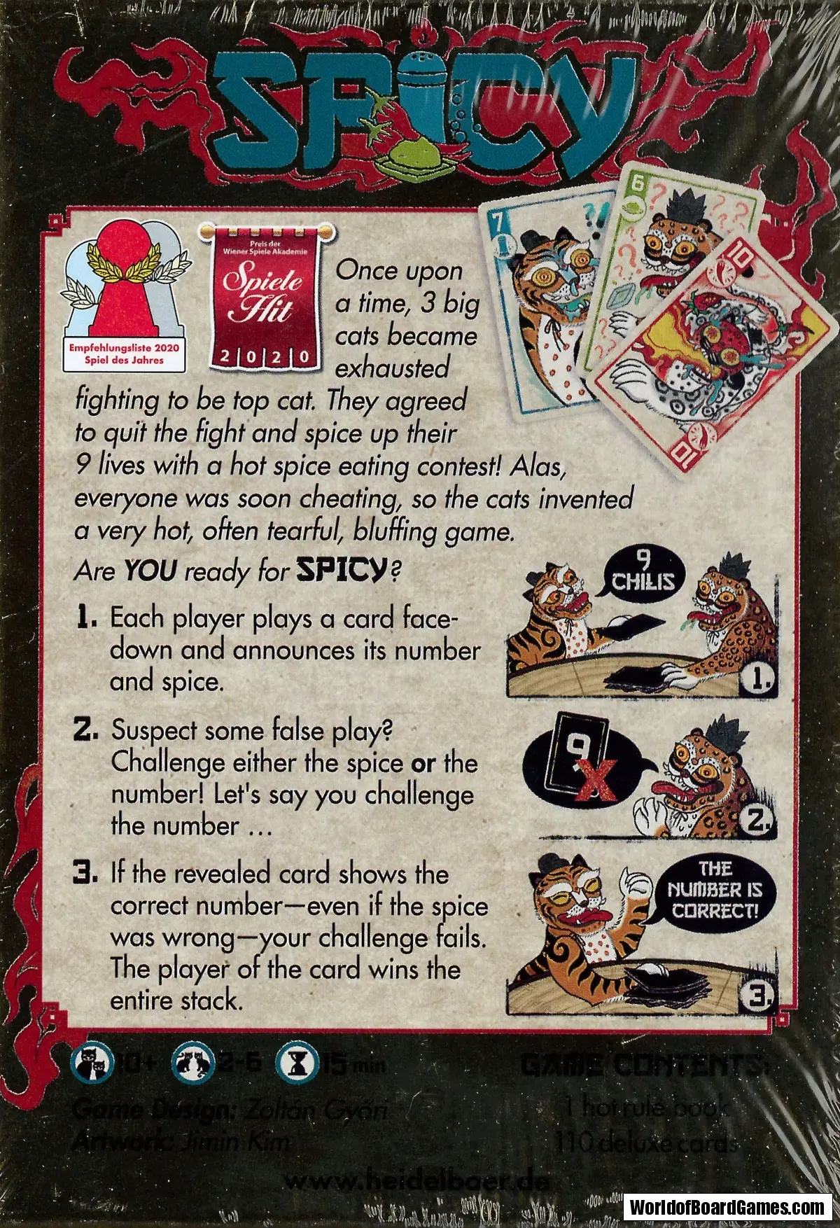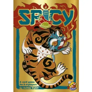 Spicy is a bluffing card game for 2-6 players. The cards are played face down, so you can cheat when you announce your card. That said, this clever card game isn't just about bluffing for you can almost always play a card that is at least half right if you cleverly play your hand. This means tactically deciding which card to use to get through: Do I play a "Pepper 10" or a color wild on a "Wasabi 9" and declare it a "Wasabi 10"? Or do I better pass because surely someone has noticed me thinking for so long now?