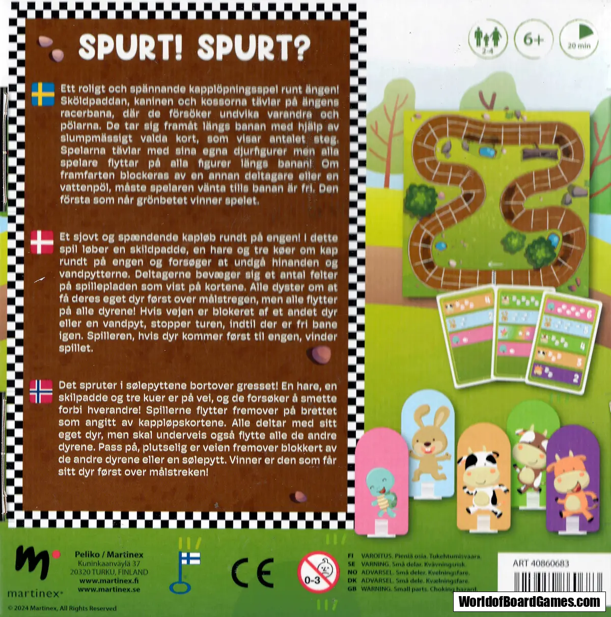 Djurvännerna tävlar på ängens racerbana, där de försöker undvika varandra och pölarna. De tar sig fram längs banan med hjälp av slumpmässigt valda kort, som visar antalet steg. Spelarna tävlar med sina egna djurfigurer men alla spelare flyttar på alla figurer längs banan! Om framfarten blockeras av en medtävlare eller en vattenpöl, måste spelaren vänta tills banan är fri. Den första som når grönbetet vinner spelet.
