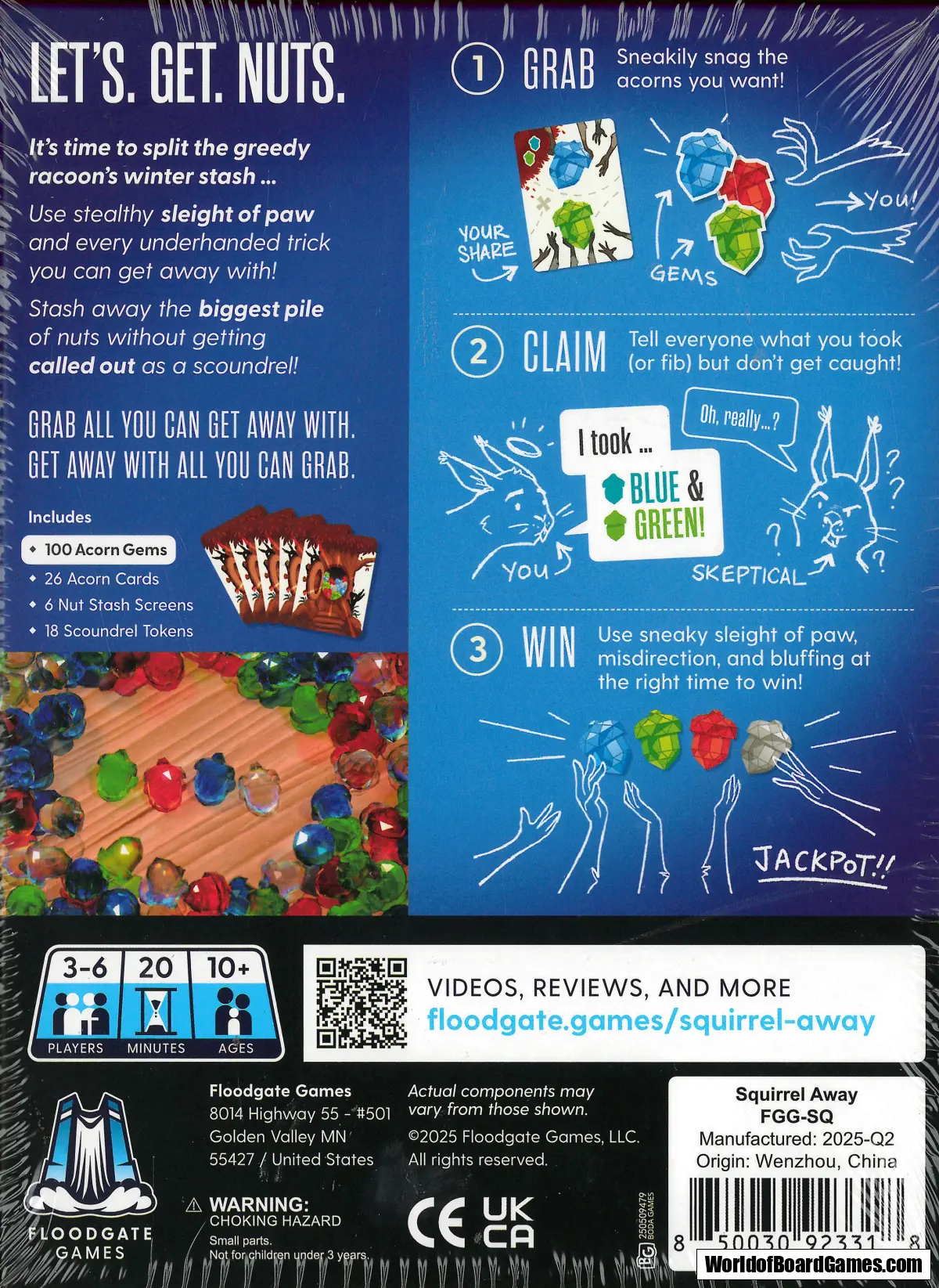Squirrel Away lets 3–6 players race to grab the biggest winter stash of acorns using bluffing, misdirection, and quick thinking.