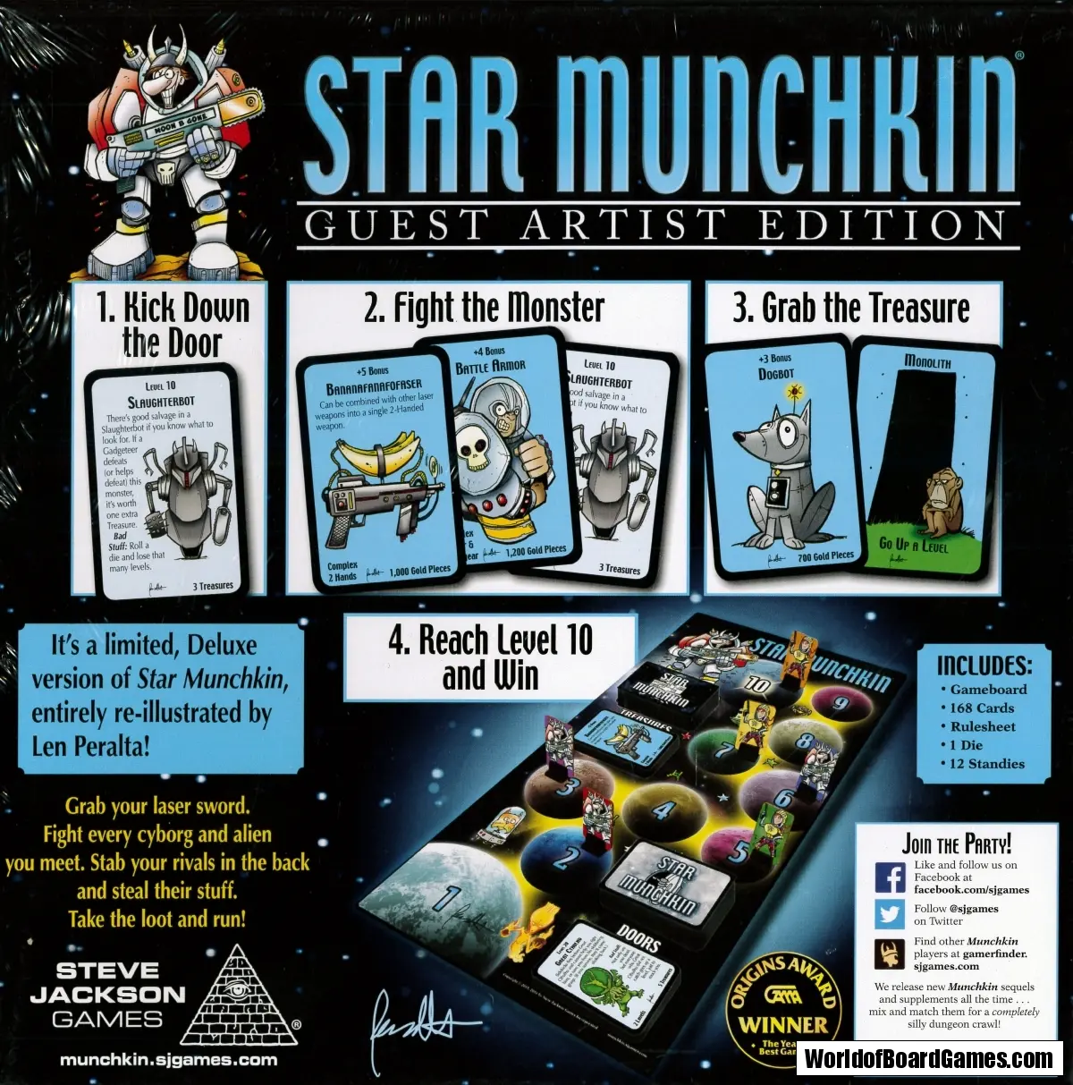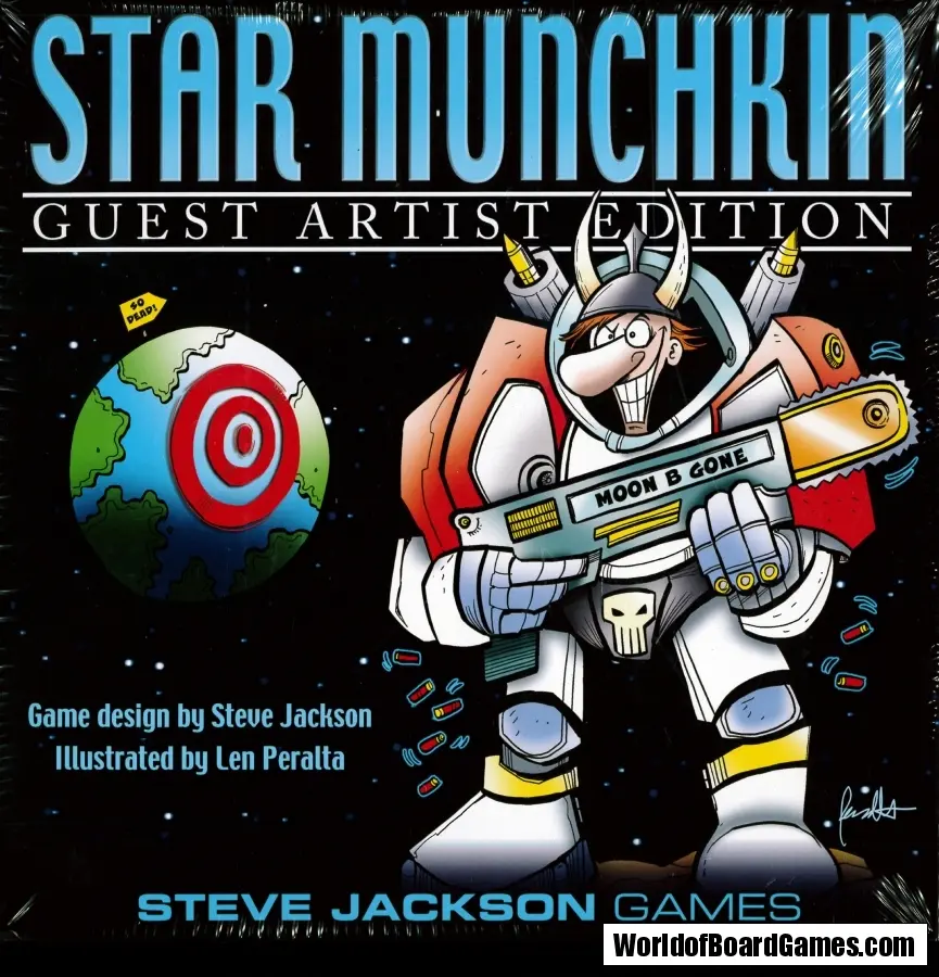 This Guest Artist Edition includes completely re-illustrated game cards, a new gameboard decorated with Len Peralta's interpretation of the Star Munchkin universe, and male and female standies for each player.