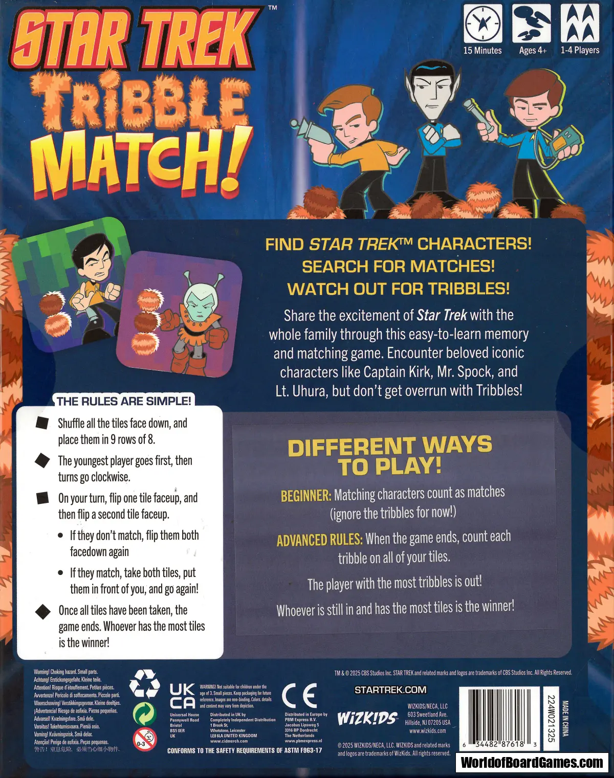 Play with the classic matching rules (flip two tiles: mis-matches flip back down as you remember their locations, or make a match and go again!) Or play with thematic tribble rules! Each tile has a number of tribbles, and you must avoid being the player with the most tribbles to win the game!