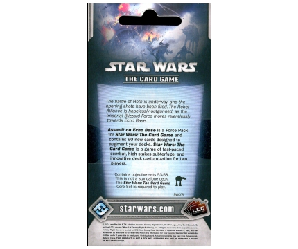 Imperial walkers march across the frozen wastelands of Hoth, and the Rebel Alliance and its allies prepare to defend themselves in Assault on Echo Base, the fourth Force Pack in The Hoth Cycle for Star Wars™: The Card Game! Will the Rebel shields hold against the Imperial onslaught? Will the Rebel defense of Hoth buy enough time for light side forces elsewhere to gather recruits and spread hope throughout the galaxy? Or will General Veers lead the Empire’s walkers and troopers to a commanding victory while bounty hunters and Black Sun mercenaries chase down the remnants of the light side resistance?