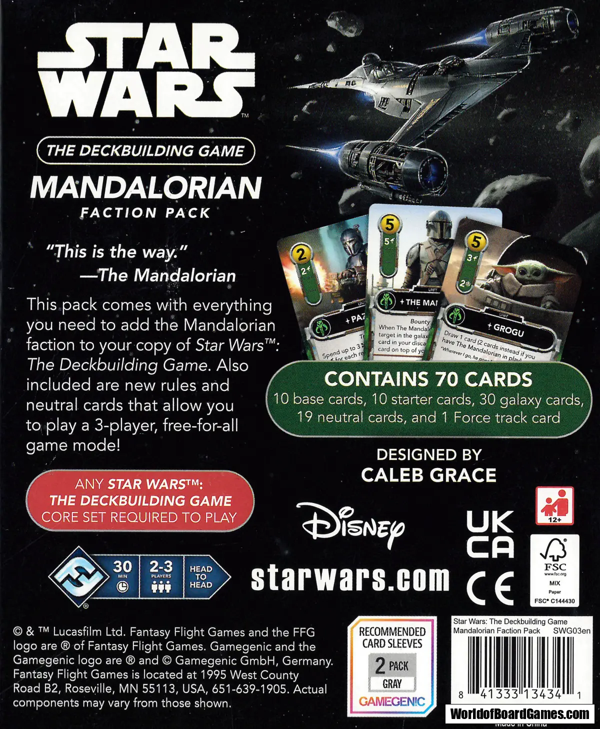 This pack comes with everything you need to add the Mandalorian faction to your copy of the game, including new base cards, starter cards, and cards for the galaxy deck. Also included are special rules and neutral cards that allow you to play an all-new, 3-player, free-for-all variant game mode!