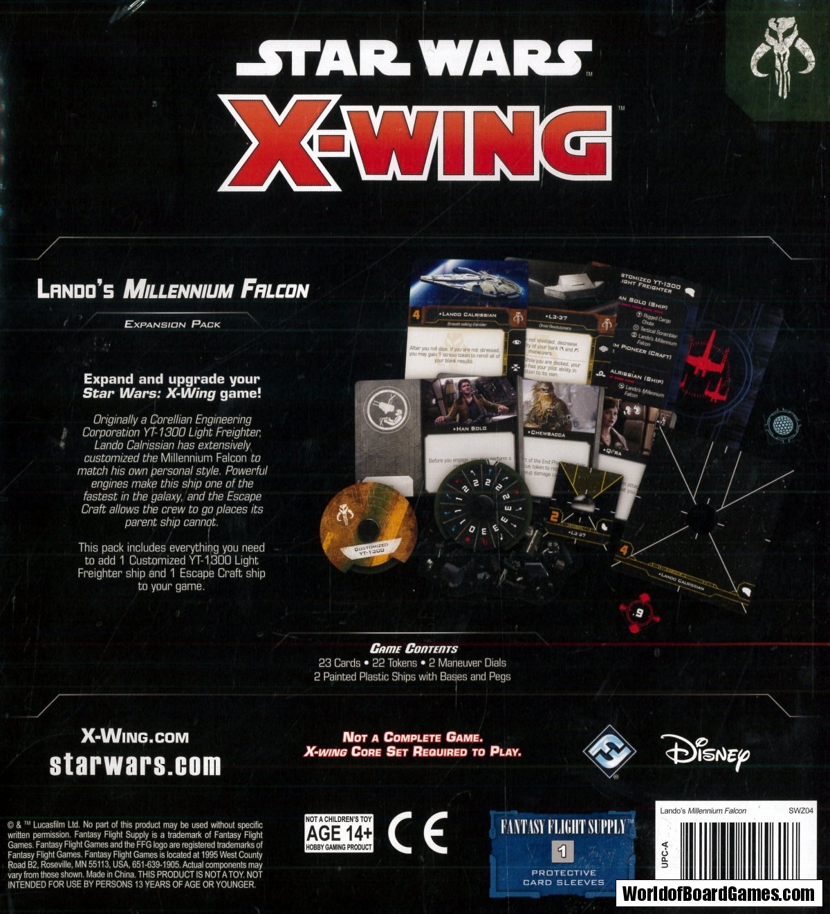 The Lando’s Millennium Falcon Expansion Pack contains a fully-assembled, pre-painted customized YT-1300 light freighter miniature, including a detachable Escape Craft miniature that can be piloted as a separate ship. In addition to these miniatures, you’ll find eight ship cards featuring classic characters like Han Solo alongside new faces like the droid revolutionary L3-37, as well as thirteen upgrade cards to further customize your version of the Falcon or your other second edition ships. Rounding out the pack are all the tokens, bases, and maneuver dials you need to add the Falcon and its Escape Craft to your squadron.