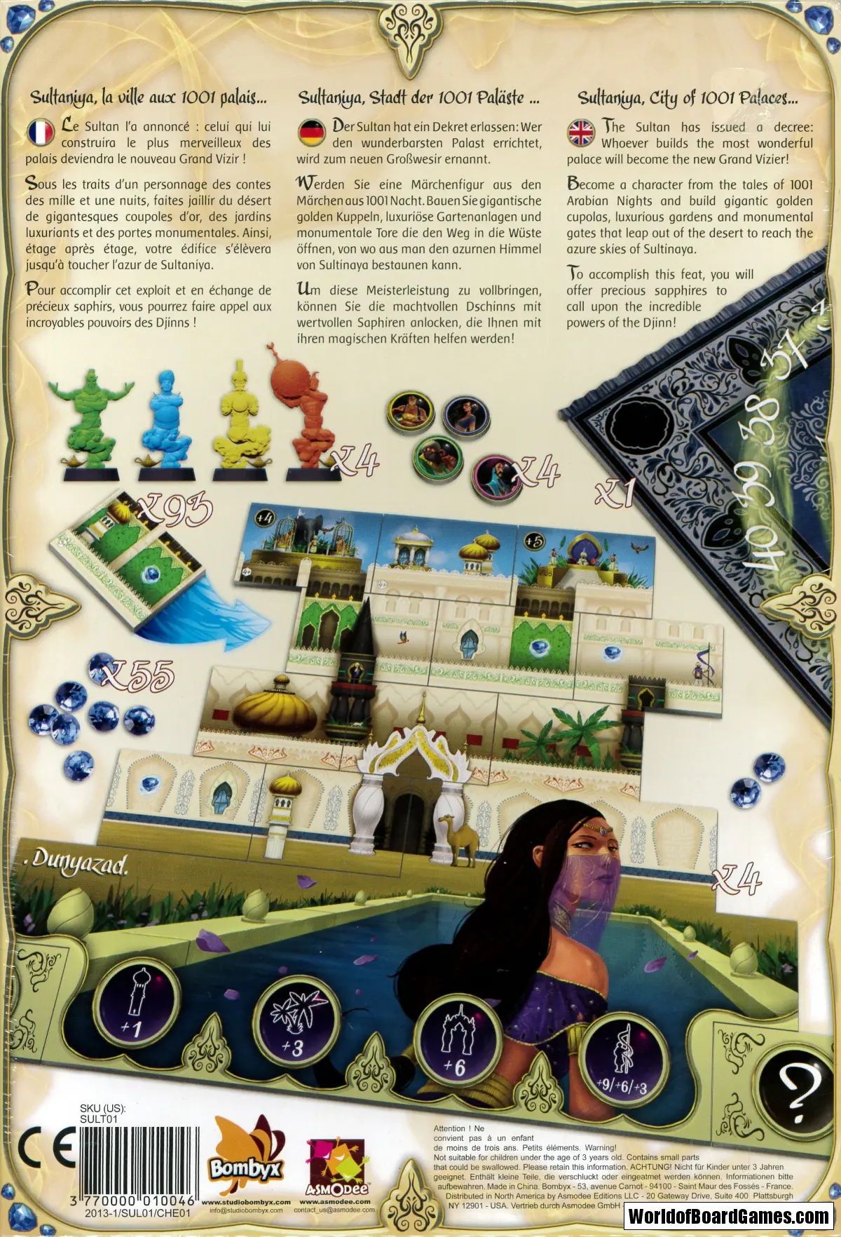 4 double-sided individual boards, 10 secret objectives, 55 sapphires, 4 Djinns, 93 double-sided building tiles, 1 score track and 4 double-sided score tokens.