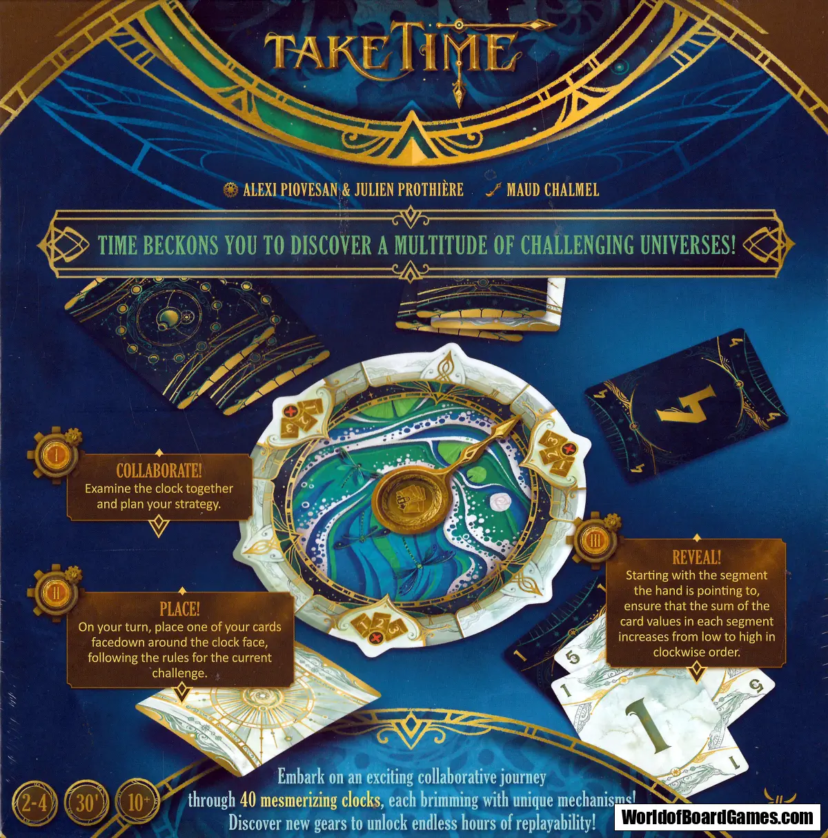 Take Time is a cooperative game where players either win or lose together. To succeed, you must strategically play 12 cards facedown around a Clock, following specific rules for each Test. You can work together through a series of games to pass all 40 Tests available in the game.