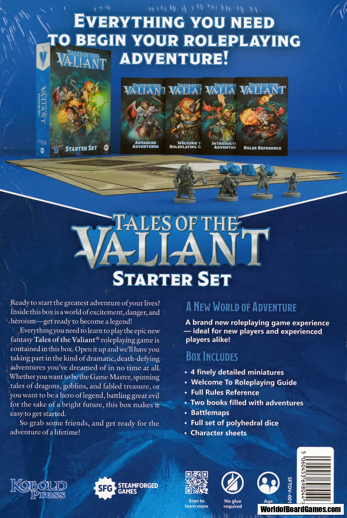 Everything you need to start playing, all in one box! Joining you on these classic fantasy adventures are four exquisite miniatures representing some of the iconic Valiant Six characters, ready to do battle and save the day. Roll your first nat20 with Tales of the Valiant!