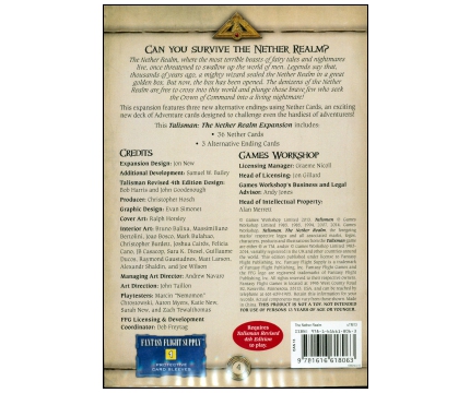 The Nether Realm offers three new Alternative Endings for Talisman, along with new Nether cards, which are used with the Pandora's Box Alternatvie Ending. When playing with this Alternative Ending, the first player to reach the Crown of Command unleashes the power of the Nether Realm against his rivals, drawing Nether cards and using them against the other players.