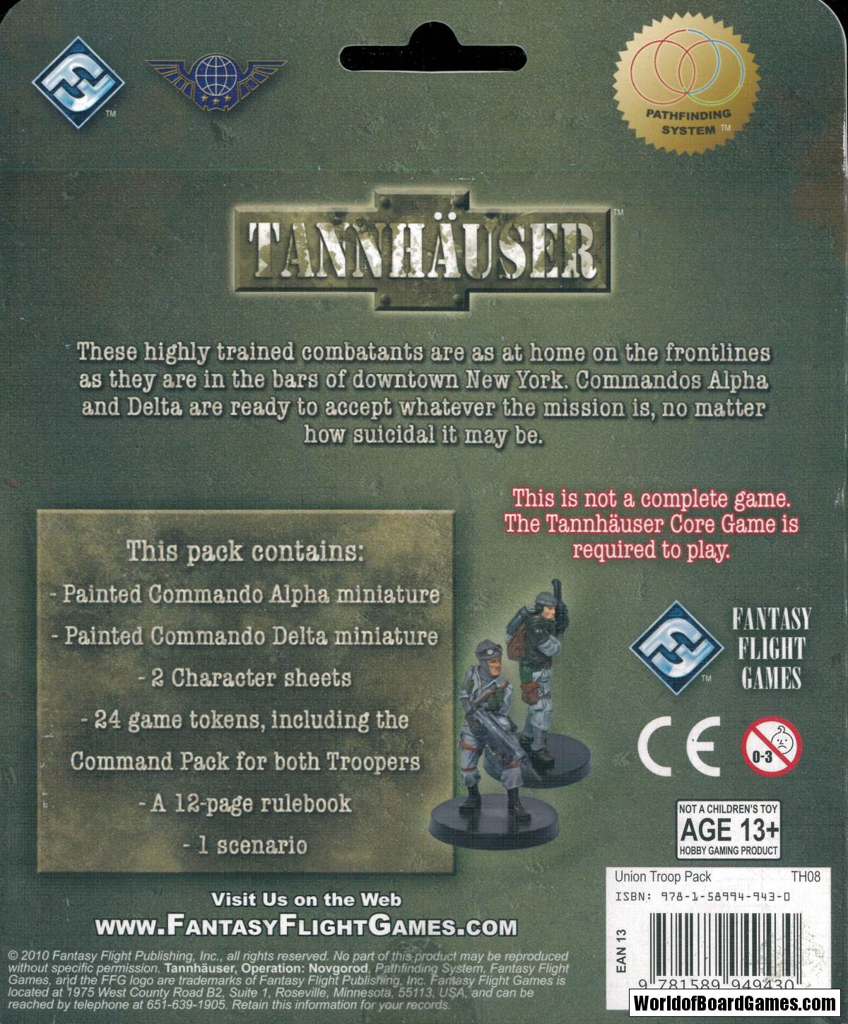 The Union Troop Pack for Tannhäuser comes with additional Commando Alpha and Commando Delta figures, one of each type. These figures feature an alternate color scheme making it easy for players to differentiate their new troops from the ones in the core game.