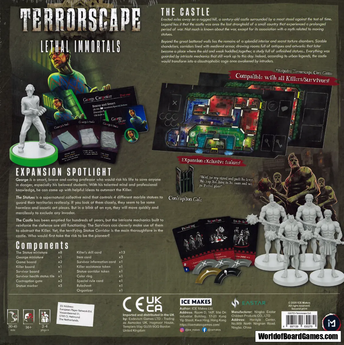 High on a rugged hill, a legendary castle holds secrets within its ancient, mechanical walls—waiting to trap any who dare to enter. Terrorscape Expansion 3: Lethal Immortals transports players to this dark fortress, introducing new challenges and horrors. This expansion includes detailed new boards for killers and survivors, unique miniatures, specialized skill cards, and additional items. With a claustrophobic new map and enhanced gameplay mechanics, Lethal Immortals raises the stakes, bringing fresh terror and strategy to Terrorscape.