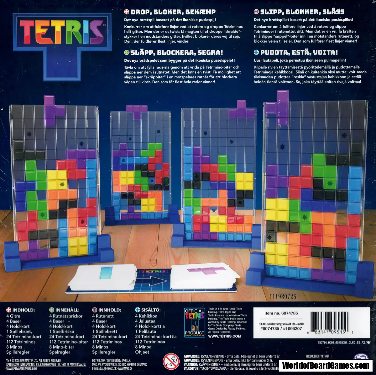 Spelet som utvecklades 1985 i Electronika 60, tog inte fart tills det lanserades med Nintendo Gameboy där det blev en stor hit. I brädspelsversionen har du samma familjära spelmekanik, där Tetriminobrickor behöver roteras och släppas ner utan att skapa för mycket luckor. Samla poäng genom att fylla horisontella rader och tjäna bonuspoäng genom att klara utmaningar. Men var snabb - den som är först med att slutföra en utmaning får flest poäng!