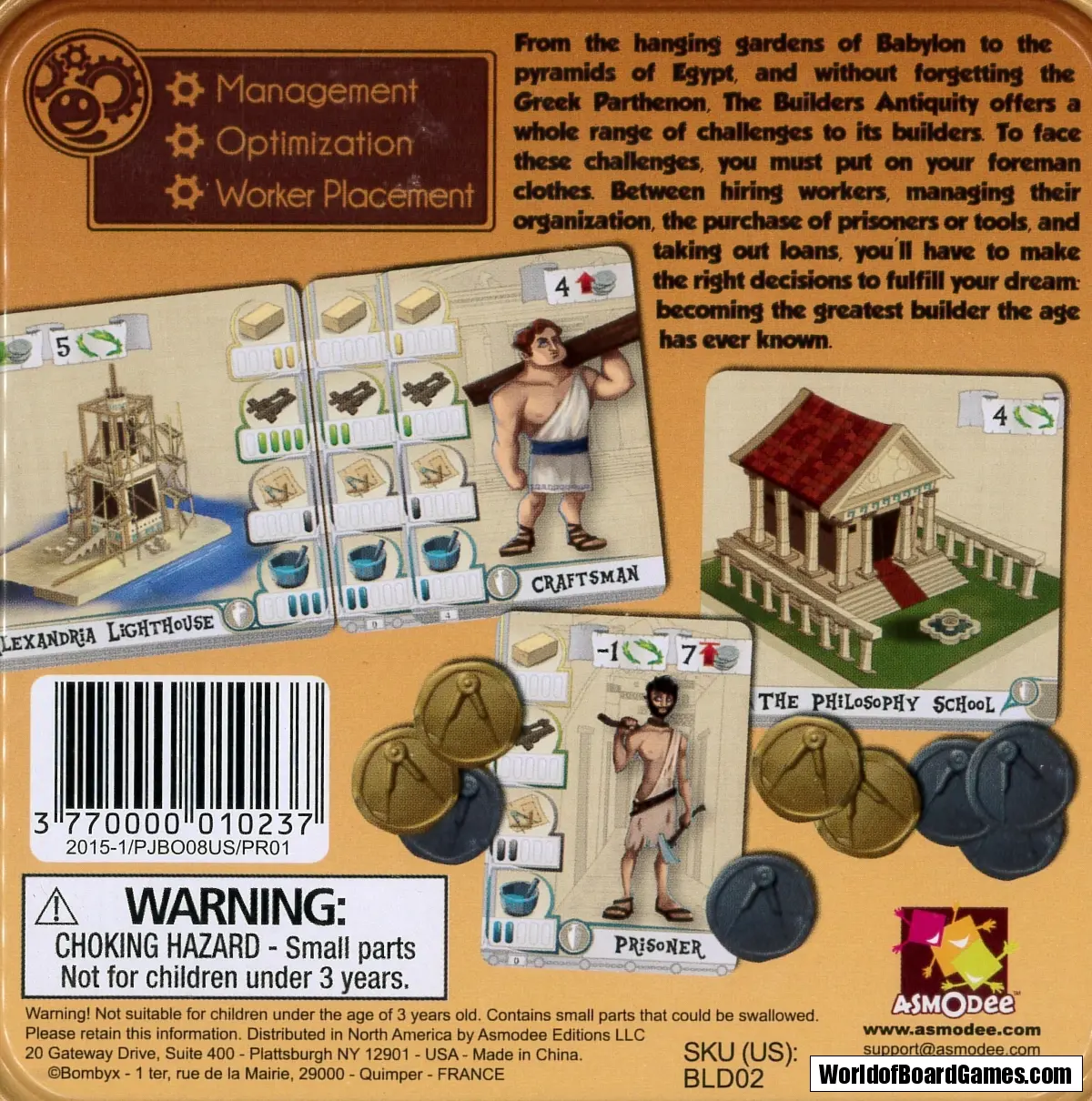 Each turn players have 3 free actions, however, for an added cost players may also chose to buy additional actions during their turn. Make use of your workers, of your slaves or your freed slaves to build your buildings and amass victory points to ultimately be named the greatest builder of all!