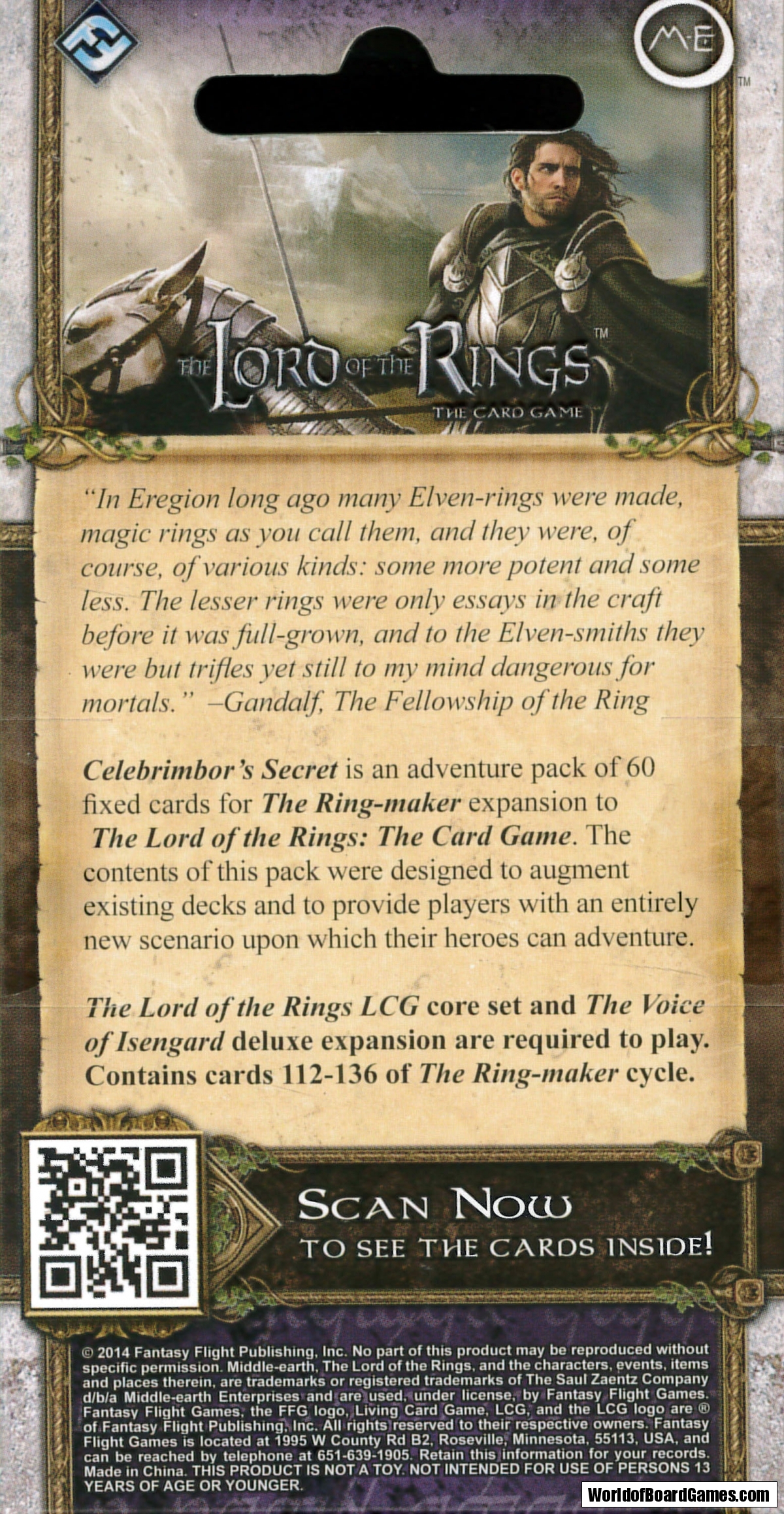 Celebrimbor’s Secret is the fifth Adventure Pack in The Ring-maker cycle for The Lord of the Rings: The Card Game. Its sixty new cards introduce a new scenario in which Middle-earth’s heroes must search through the ruins of Ost-in-Edhil for the secret location of Celebrimbor’s abandoned forge, even as they are beset by a host of Mordor Orcs that have somehow made it to the ruins ahead of the heroes. You’ll also find a powerful new hero – Galadriel, the Lady of Lothlórien – and new player cards for each sphere (three copies of each). These cards lend greater strength to the Silvan and Noble traits, as well as the Doomed X mechanic.