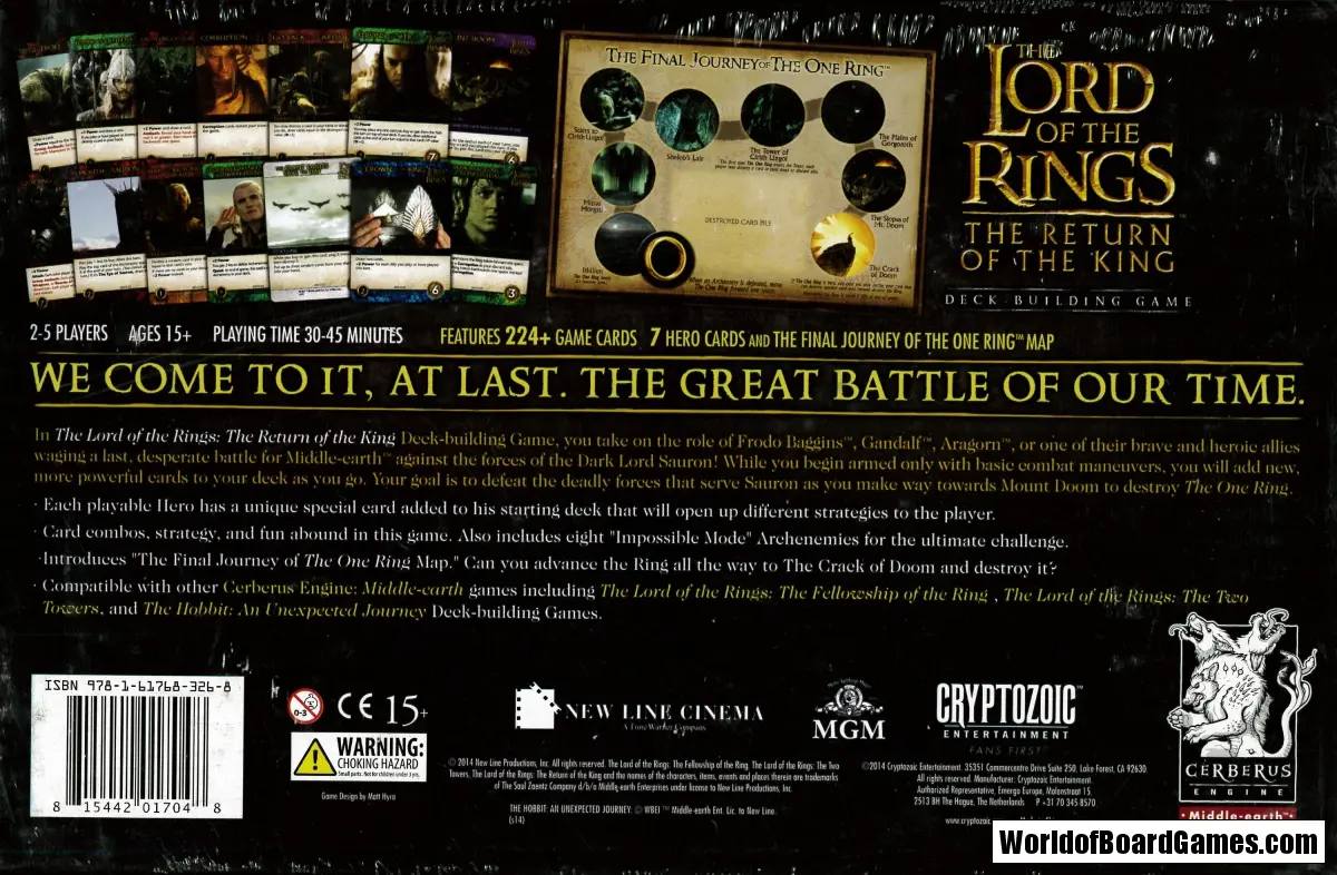 In The Lord of the Rings: The Return of the King Deck-building Game, you take on the role of Frodo, Legolas, Aragorn, or one of their brave and heroic allies in the struggle against the forces of the Dark Lord Sauron! While you begin armed only with the courage of the free peoples of Middle-earth™, you will add new, more powerful cards to your deck as you go. Your goal is to defeat the deadly forces that serve Sauron as you make way towards Mount Doom to destroy The One Ring.