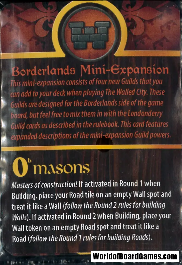 The Borderlands Mini-Expansion contains 4 new Guild Cards for use with the Borderlands map in Mercury Games' "The Walled City".