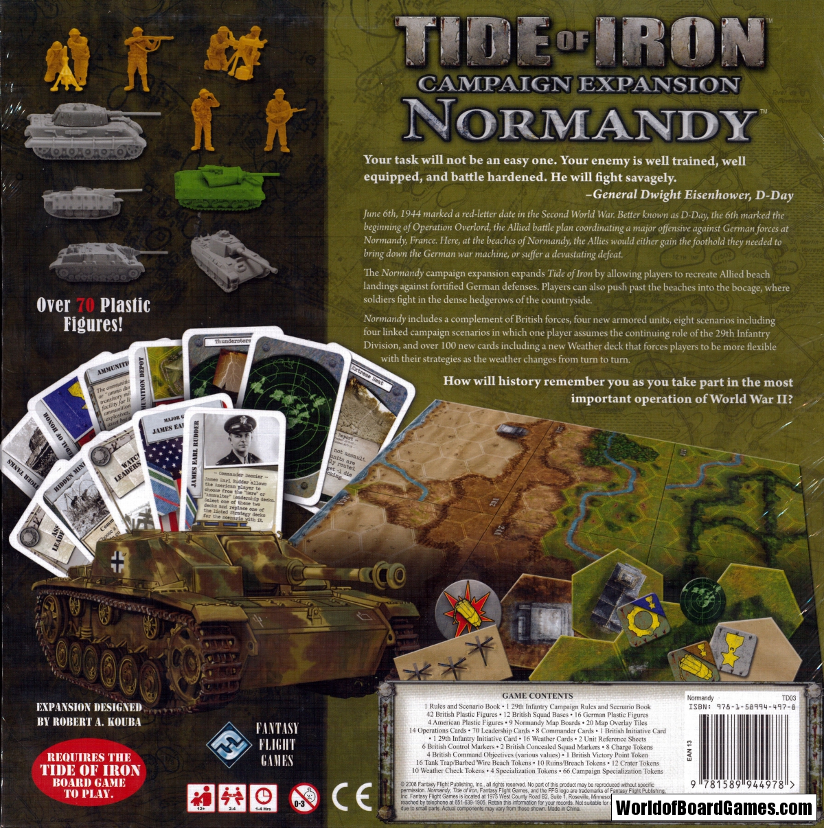 The Normandy Campaign Expansion expands the Tide of Iron base game by allowing players to recreate Allied beach landings against fortified German defenses. Players can also push past the beaches into the bocage, where soldiers fight in the dense hedgerows of the countryside.