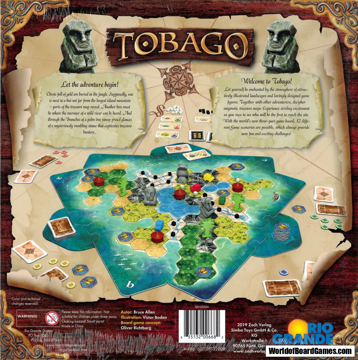 The attractive, top-quality game pieces on the lovingly illustrated game board give the impression of a true mysterious treasure island. Each player contributes valuable clues, which determine where the treasures are located. The excitement mounts as the adventurers strive to be the first to arrive at the treasure sites. The 3-piece game board with its innovative design can be set up with 32 different scenarios, each providing fun and a new challenge.