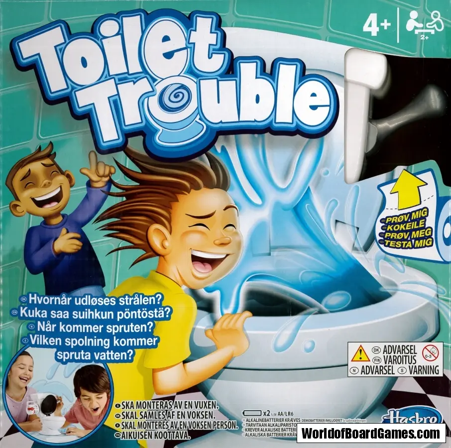 Which flush will cause the gush? Share some hilarious and suspense-filled moments as players take turns spinning the toilet paper roll, flushing the toilet handle, and hoping they don't get sprayed with water! The number that turns up on the paper roll spinner dictates how many times each player must flush. Players are safe if they hear the flushing sound, but no water is sprayed. Who knows which flush will be the one that sprays water, eliminating that player? Continue taking turns spinning the roll and flushing until one player has not been sprayed. That player wins the game!