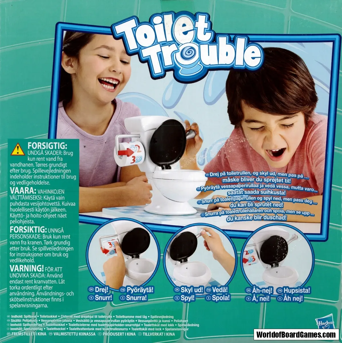 Includes game base, toilet base, toilet tank with toilet paper roll spinner, toilet bowl with lid, and instructions.