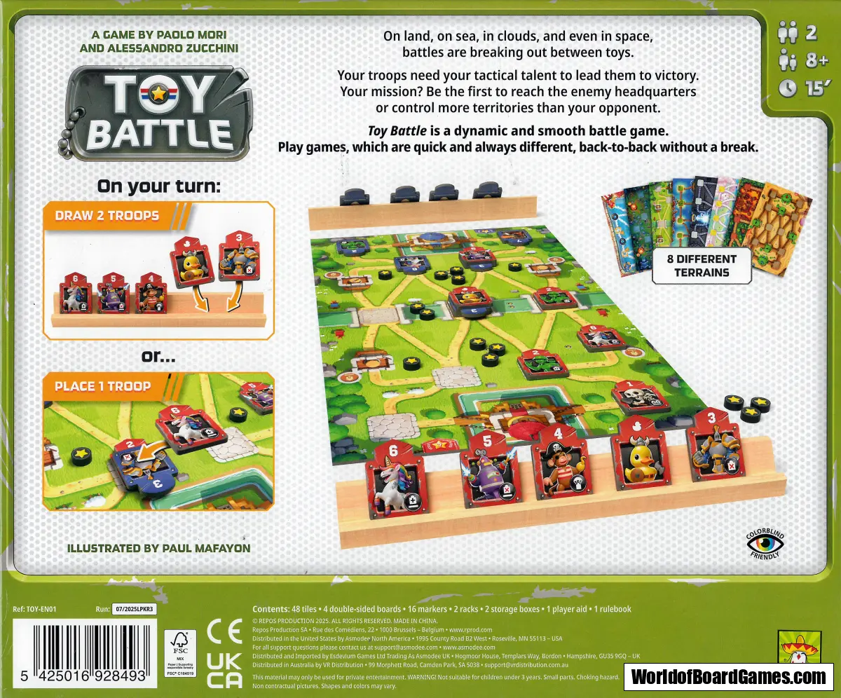 On your turn in Toy Battle, you either draw two toy troops or place a troop on the board and apply its effect. When you place a troop, you can place it on an empty base, a base that you control, a base that the enemy controls with a lower-valued troop than the one you're placing, or the enemy's headquarters; however, in all cases you must place on a location that has a continuous path to your own headquarters through bases that you occupy, that is, that have your troop on top. If you occupy bases that form a continuous path around a region, you claim the medals within this region. (You don't lose these medals if the enemy later occupies one of these bases.)
