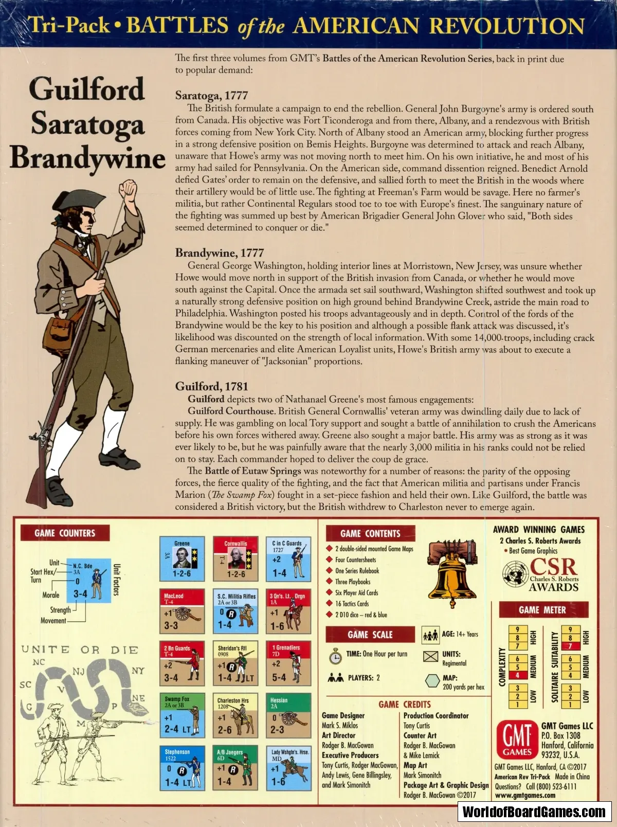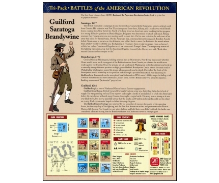 In order to get several of the popular AmRev series games back in print, we are offering an American Revolution Tri-Pack. This all-in-one boxed package is composed of new editions of the flagship game in the series -Saratoga, the long-out-of-print Brandywine, and Guilford/Eutaw Springs. Below is more detail on exactly what you’ll find in the package. As you’ll note, there are considerable additions and changes from the original games, as designer Mark Miklos has endeavored to create and update the finest version of these games that we’ve produced to date. Plus, the package includes double-sided mounted maps for all four battles!