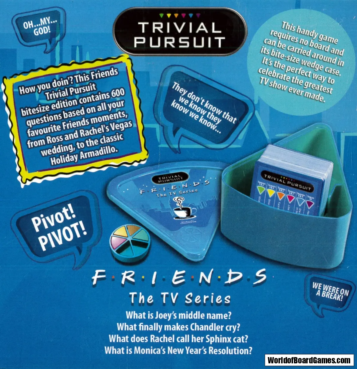 Woo-pah! If you are a true Friends fan, you need to test your knowledge with the Friends Trivial Pursuit game! This edition contains 600 questions based on all your favourite moments from Ross and Rachel's Vegas wedding, to the classic Holiday Armadillo. Test your trivia from Season 1 right through to Season 10 and prepare to be totally bamboozled. The game is handy for any Friends fan on the go, requiring no board and an easy to carry around in its bitesize wedge case.