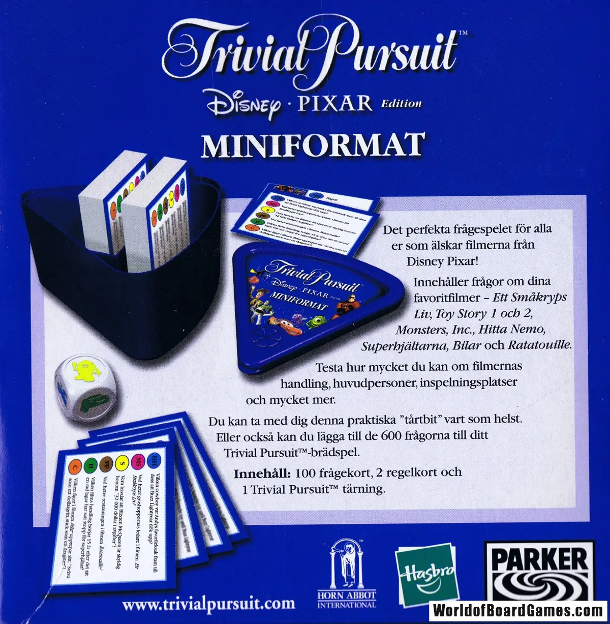 Ett spel i fickformat. Trivial Pursuit har alltid varit ett populärt familjespel. Nu fortsätter succén med Disney-versionerna med ett snabbt spel i fickformat som handlar om de fantastiska filmerna från Disney Pixar – i en praktisk storlek.