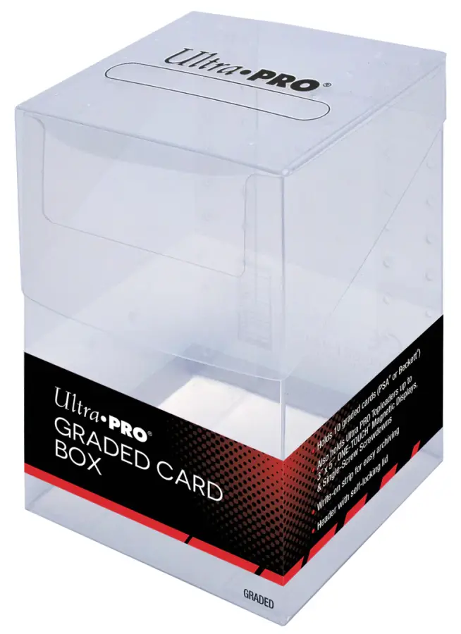 Store and archive your valuable graded cards with this clear, easy-to-use storage box made with archival-safe polypropylene material. Clear, see-through walls allow you to quickly check the contents to ensure you are pulling the right collection of graded cards, while a write-on strip on top allows you to label and easily identify the right set. This Graded Card Box is sized to hold 10 PSA or Beckett graded cards. Also holds ULTRA PRO® Toploaders up to 3" x 5", ONE-TOUCH® Magnetic Displays, & Single-Screw Screwdowns.