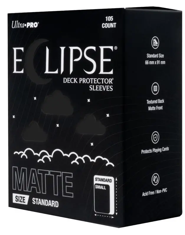 The next evolution of Ultra PRO’s legendary ECLIPSE® DECK PROTECTOR® sleeves is here. Experience the enhanced texture, optimized shuffle feel, and the rigorously tested, consistent quality of the latest ECLIPSE® formulation. Designed for competitive play and archival collections, ECLIPSE® DECK PROTECTOR® sleeves feature fully-opaque backings and split-resistant seals. ECLIPSE® DECK PROTECTOR® sleeves are available in matte and gloss fronts, standard and small sizes, and 10 vibrant colors.