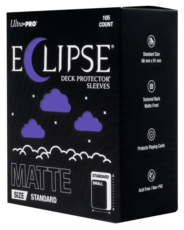 The next evolution of Ultra PRO’s legendary ECLIPSE® DECK PROTECTOR® sleeves is here. Experience the enhanced texture, optimized shuffle feel, and the rigorously tested, consistent quality of the latest ECLIPSE® formulation. Designed for competitive play and archival collections, ECLIPSE® DECK PROTECTOR® sleeves feature fully-opaque backings and split-resistant seals. ECLIPSE® DECK PROTECTOR® sleeves are available in matte and gloss fronts, standard and small sizes, and 10 vibrant colors.