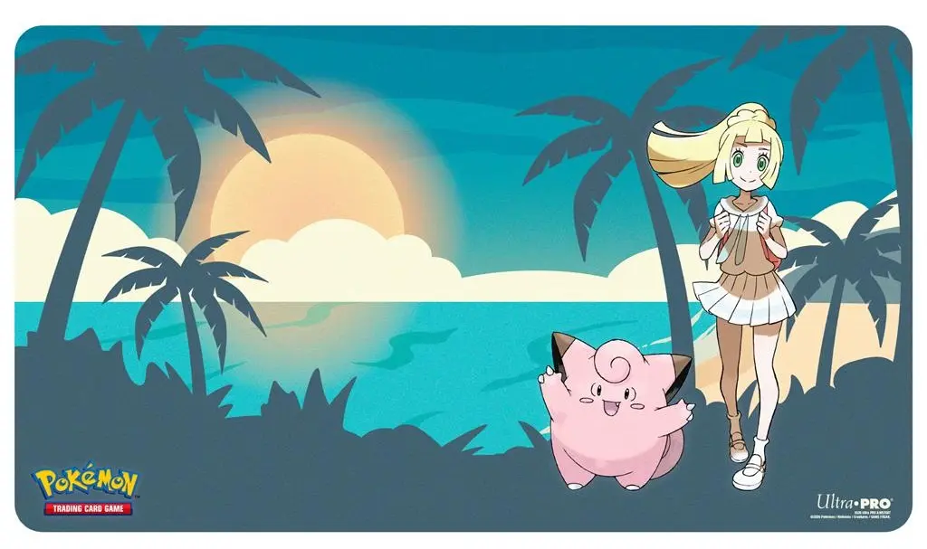 The playmat for the Pokémon Trading Card Game features vibrant, full-color artwork of Lillie and Clefairy. Made with a soft fabric top, playmats provide a safe gameplay surface, and a non-slip rubber backing keeps the playmat in place. With dimensions of approximately 24 in. x 13.5 in., a playmat also makes an excellent oversize mousepad for home or office.