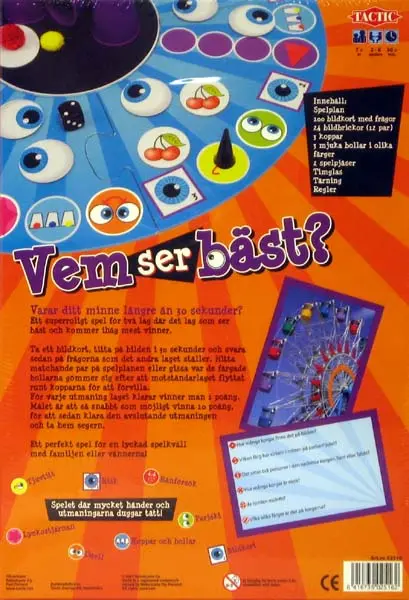 Varar ditt minne mer än 30 sekunder? Ett superroligt spel för två lag där det lag som ser bäst och kommer ihåg mest vinner. Ta ett bildkort, titta på bilden i 30 sekunder och svara sedan på frågorna som det andra laget ställer. Hitta matchande par på spelplanen eller gissa var de färgade bollarna gömmer sig efter att motståndarlaget flyttat runt bägarna för att förvilla. För varje utmaning man klarar vinner laget 1 poäng. Målet är att bli det första laget som vinner 10 poäng och sedan svara rätt på 3 avslutande bildfrågor. Det perfekta spelet för en lyckad spelkväll med familjen eller vännerna!