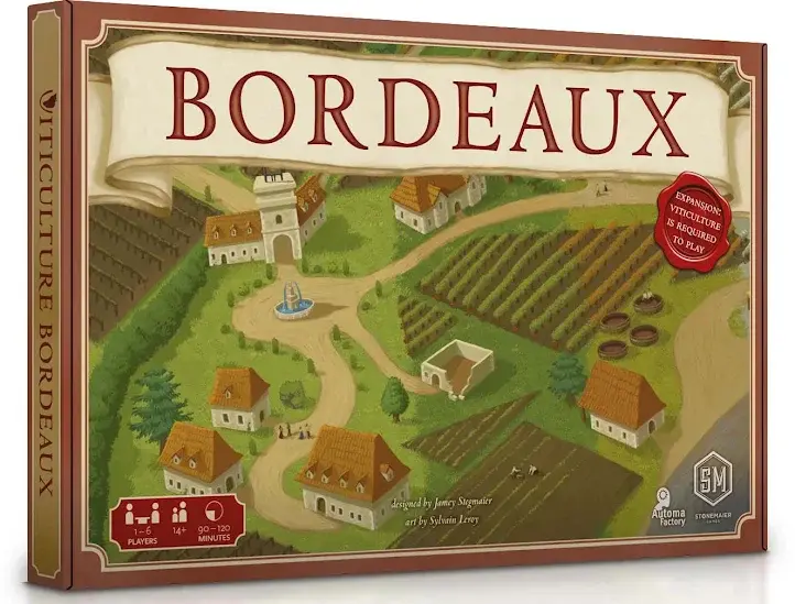 The Bordeaux alternative board expansion to Viticulture offers 4 full worker placement seasons, a wake-up chart full of benefits, new actions and revisions to existing actions, a trade market, and some face-up cards to choose from when drawing. Additionally, the back side of the board is the base Viticulture board, redesigned to include the face-up Vine Card and Wine Order markets introduced with Bordeaux. Automa Factory have designed a new solo mode compatible with this expansion.