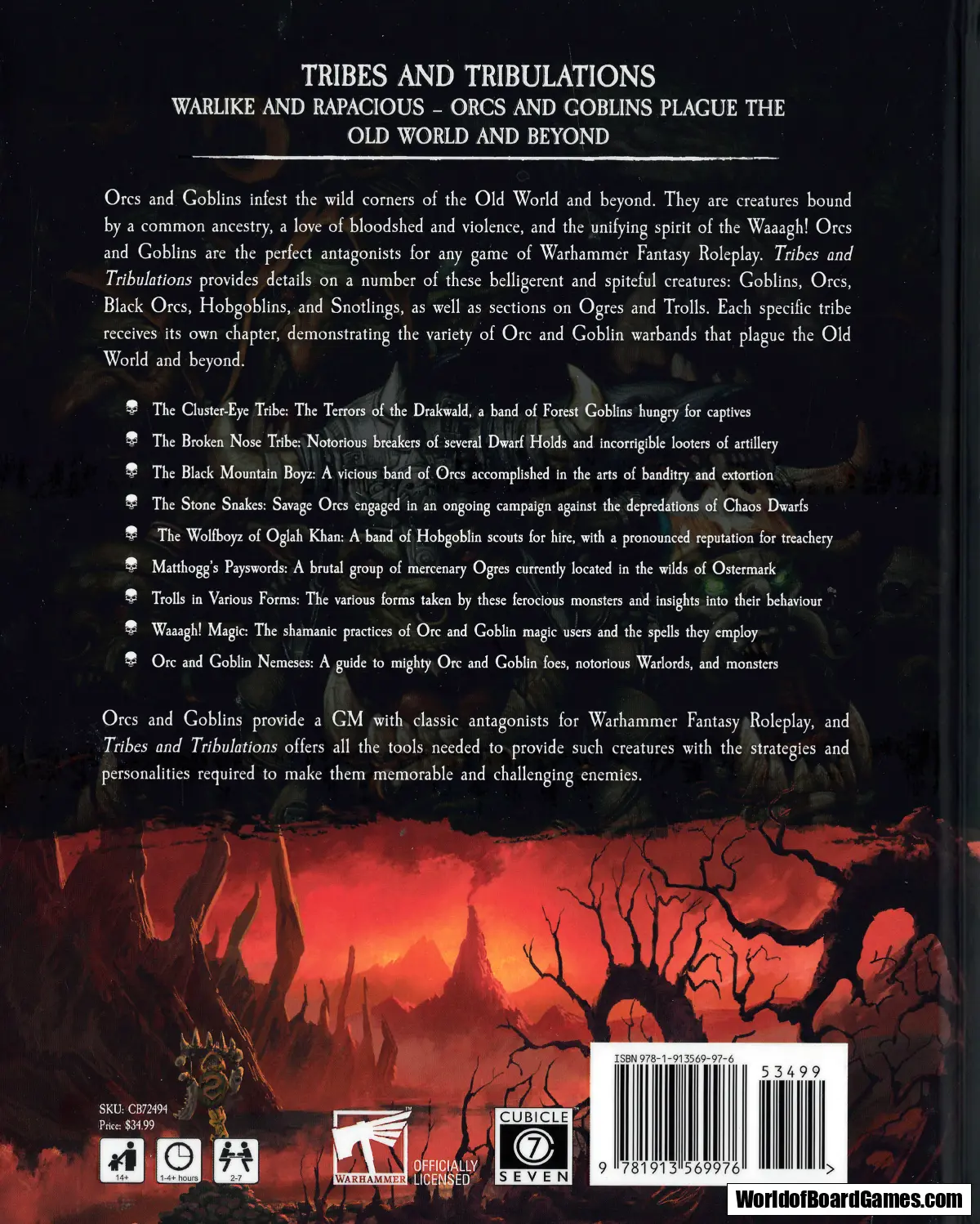 Orcs and Goblins infest the wild corners of the Old World and beyond. They are creatures bound by a common ancestry, a love of bloodshed and violence, and the unifying spirit of the Waaagh! Orcs and Goblins are the perfect antagonists for any game of Warhammer Fantasy Roleplay. Tribes and Tribulations provides details on a number of these belligerent and spiteful creatures: Goblins, Orcs, Black Orcs, Hobgoblins, and Snotlings, as well as sections on Ogres and Trolls. Each specific tribe receives its own chapter, demonstrating the variety of Orc and Goblin warbands that plague the Old World and beyond.