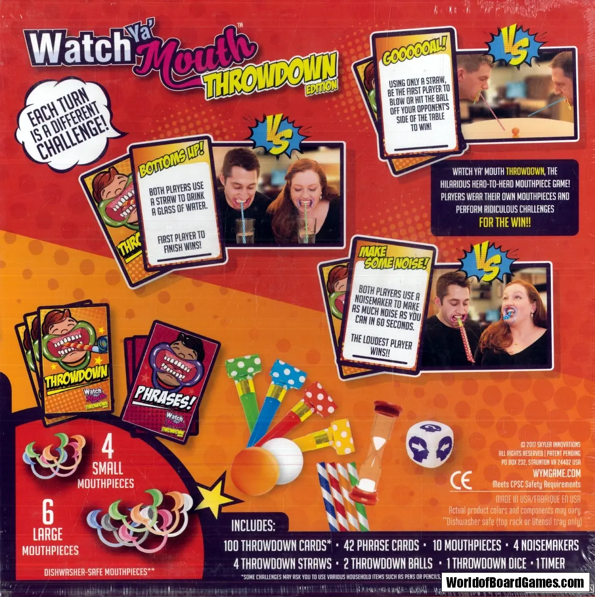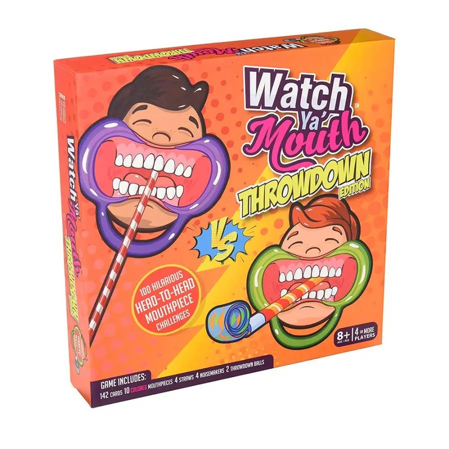 With Watch Ya’ Mouth Throwdown Edition, 4-10 players face off in our mouthy mashup of all your favorite bar games, relay race activities, and acting, singing, and drawing throwdowns —with some social media twists.