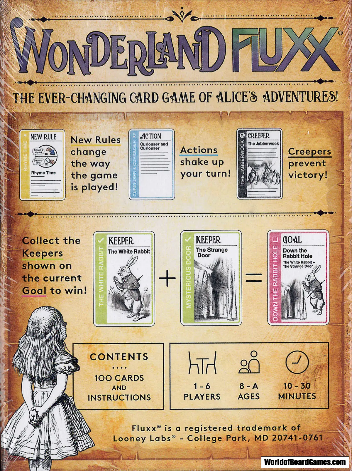 Wonderland Fluxx takes the chaotic fun of the classic Fluxx card game and adds a whimsical twist inspired by Alice’s Adventures in Wonderland! Dive into the world of Wonderland, where the rules change as fast as the characters! Meet the Mad Hatter, the Cheshire Cat, and Tweedle Dee and Tweedle Dum, as you try to make your way through this topsy-turvy world. With a constantly shifting set of goals, actions, and rules, Wonderland Fluxx is perfect for anyone who loves the unpredictable fun of Fluxx, mixed with a bit of Alice’s peculiar charm.