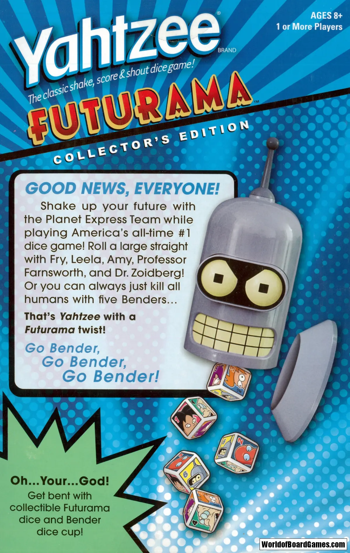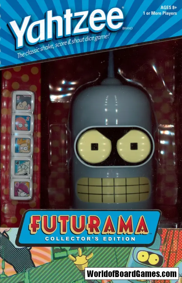 Shake up your future with the Planet Express Team while playing America’s all-time #1 dice game. Roll a large straight with Fry, Leela, Amy, Professor Farnsworth and Dr. Zoidberg! Or, you can always just kill all humans with five Benders. That’s YAHTZEE with a Futurama twist!