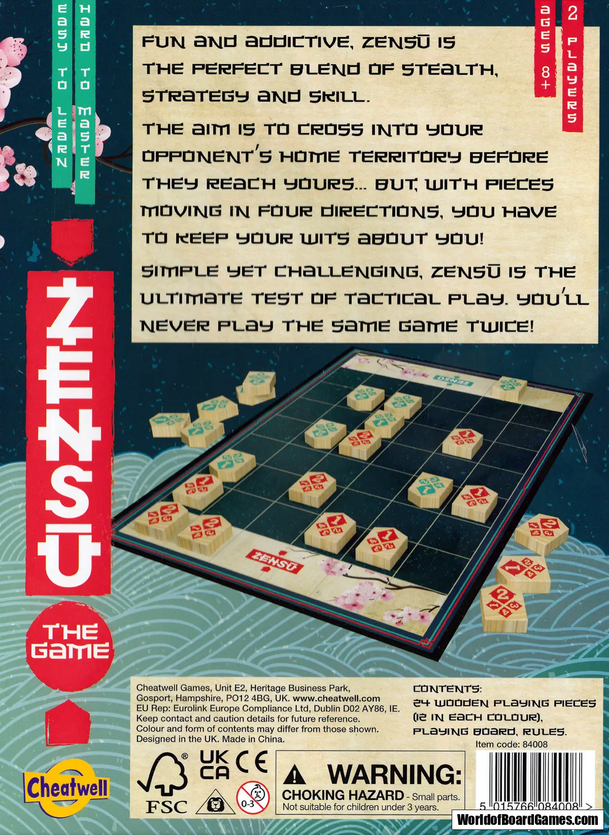Zensū is the new strategy game that’s simple to learn but hard to master! The aim is to cross your opponent’s border before they can cross into yours but, with pieces moving in four directions you have to keep your wits about you! Get it wrong and your opponent’s pieces will take you down! With Zensū you’ll never play the same game twice!