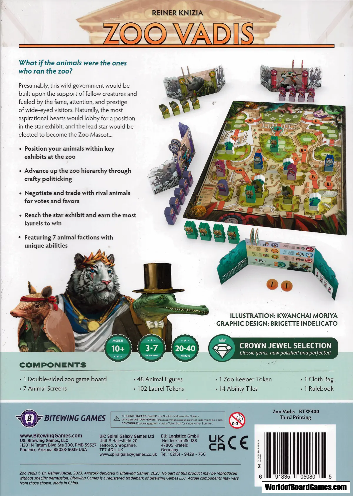 Zoo Vadis transports players into an imaginative zoo ruled by animals, where strategic negotiation and cunning political maneuvers determine who becomes the Star Mascot. Players must skillfully lobby for support, earning laurels from allies and rivals alike, while strategically moving their species up the hierarchy. Featuring simple yet deep mechanics and rich player interactions, Zoo Vadis promises endless replayability and tense decision-making moments. Perfect for casual gatherings and intense gaming sessions, Zoo Vadis brings delightful drama and strategic depth to your tabletop.