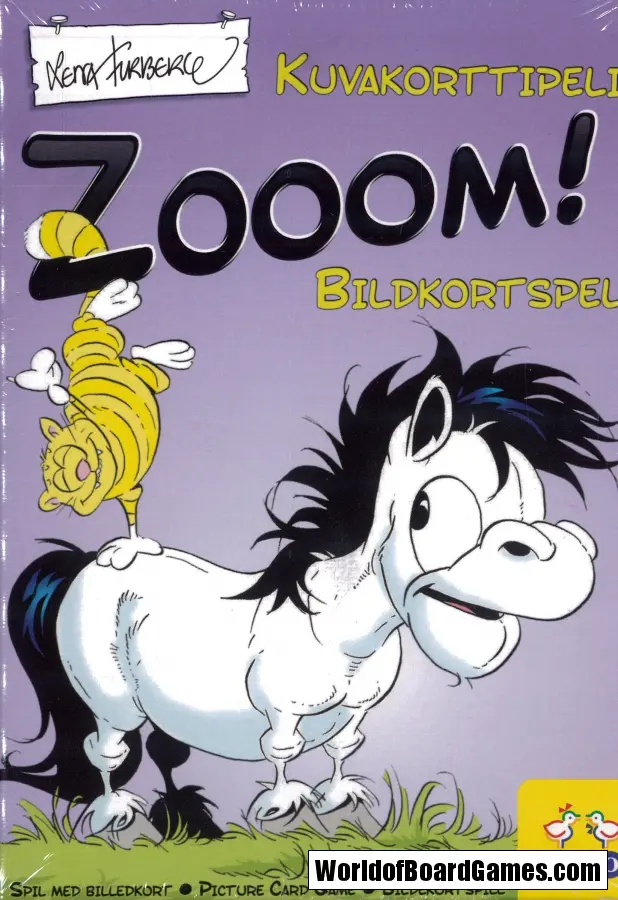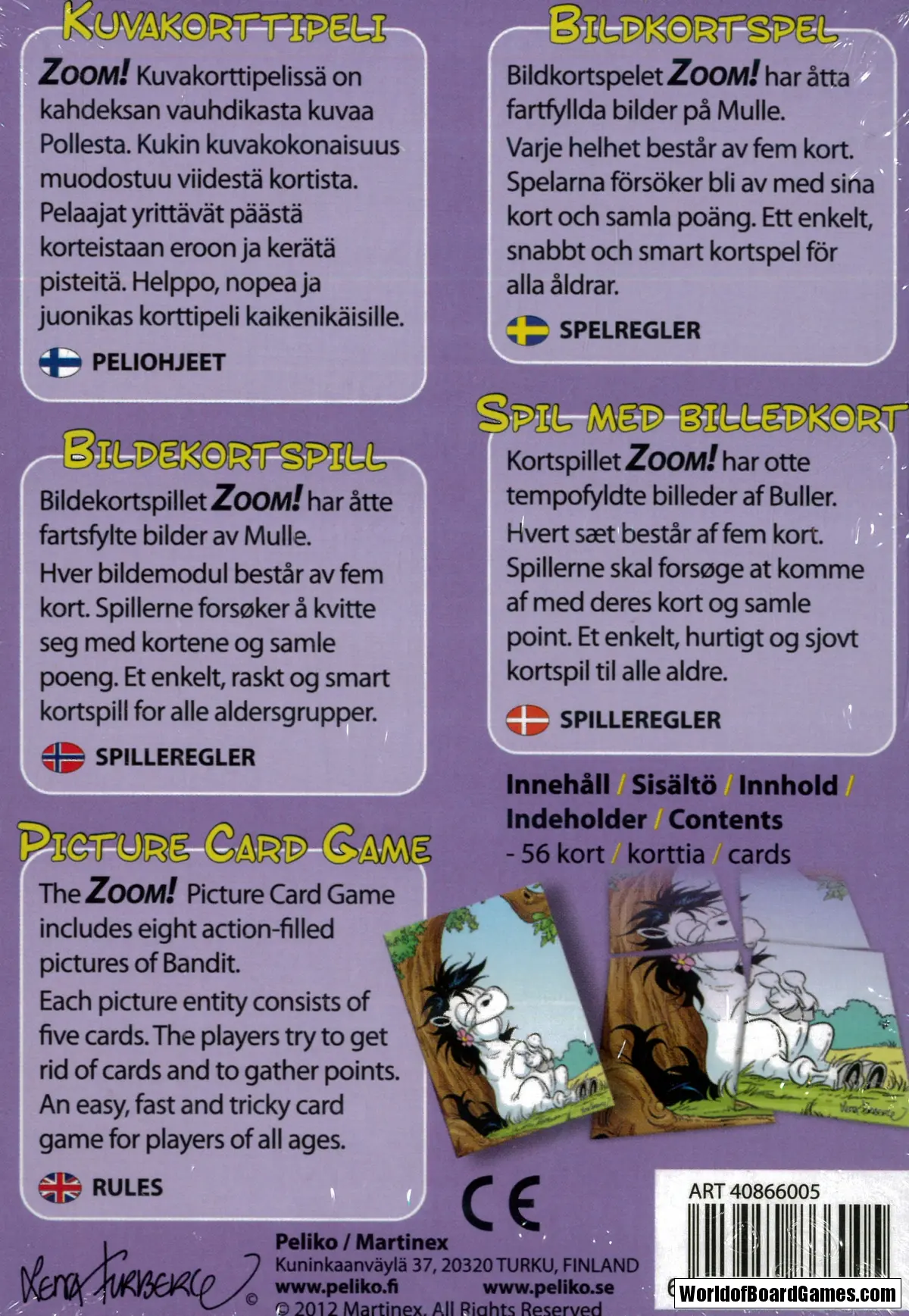 Bildkortspelet Zoom! har åtta fartfyllda bilder på Mulle. Varje helhet består av fem kort. Spelarna försöker bli av med sina kort och samla poäng. Ett enkelt, snabbt och smart kortspel för alla åldrar.